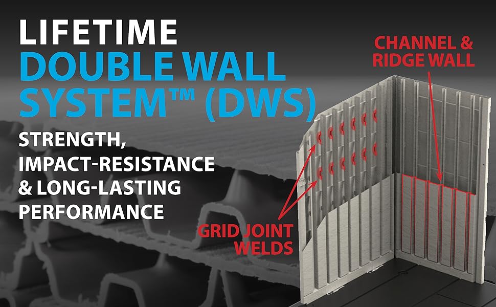Product Dimensions 294.64 x 233.68 x 243.84 cm; 256.28 kg Part number 60005 Item display height 243.8 centimetres Item display length 233.6 centimetres Item display width 294.6 centimetres Item display weight 196.5 Kilograms Material type Plastic Capacity 494.5 Cubic Feet Manufacturer Lifetime Item model number 60005 ASIN B0015MBX8U