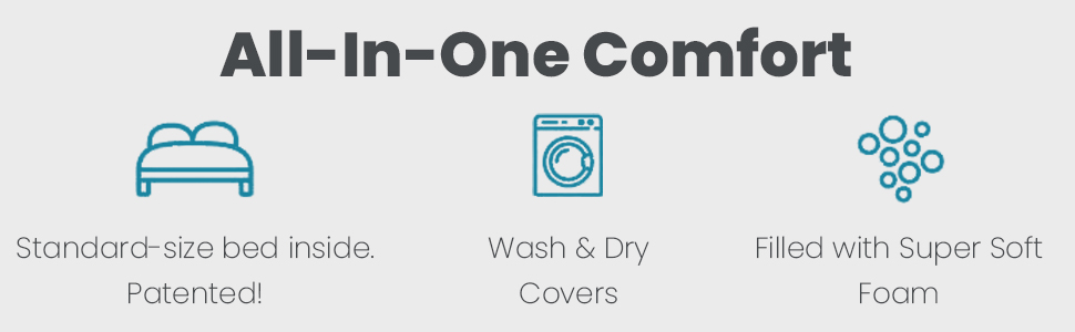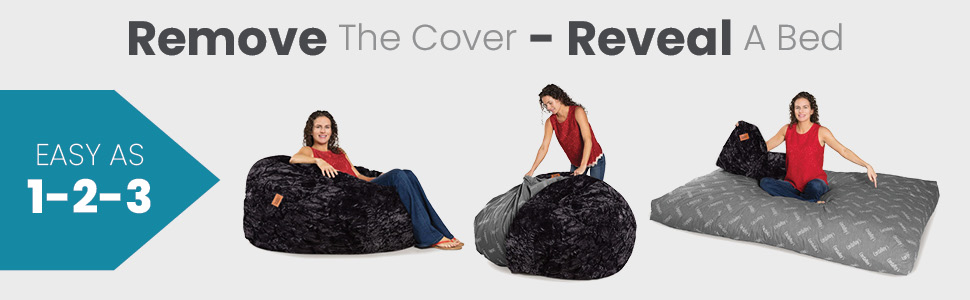 CHAIR TO BED IN A SNAP: Simply remove the cover and flip inner cushion to turn into a bed. Fold and slide into cover to convert back to a chair. So easy, the kids can do it!